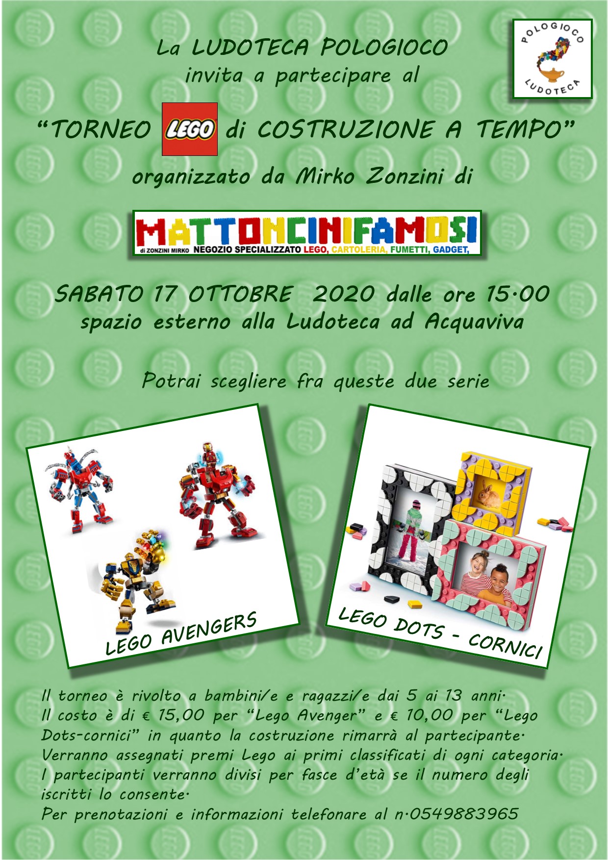 - sabato 17 ottobre dalle ore 15.00 ci sarà il "Torneo Lego di costruzioni a tempo" organizzato da Mirko Zonzini di MATTONCINIFAMOSI. Il torneo verrà svolto nello spazio esterno della Ludoteca ed è rivolto ai partecipanti da 5 a 13 anni;