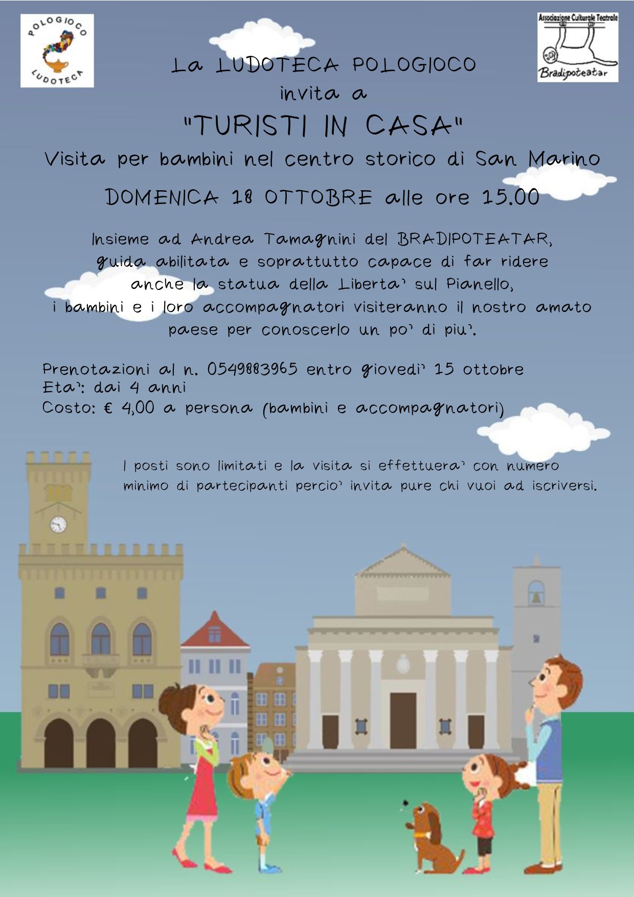 - domenica 18 ottobre alle ore 15.00 con "Turisti in casa" siete invitati a partecipare ad una visita nel centro storico di San Marino insieme ad Andrea Tamagnini del BRADIPOTEATAR. Età dai 4 anni;