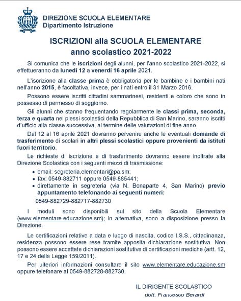 Nella settimana dal 12 al 16 aprile 2021 si svolgeranno le iscrizioni degli alunni alla classe prima per l'anno scolastico 2021-2022. In tale periodo si potranno, altresì, inoltrare le domande per eventuali trasferimenti degli alunni di classe seconda, terza, quarta e quinta elementare in altri plessi a causa di eventuali cambi di residenza del nucleo familiare o di altre motivazioni.